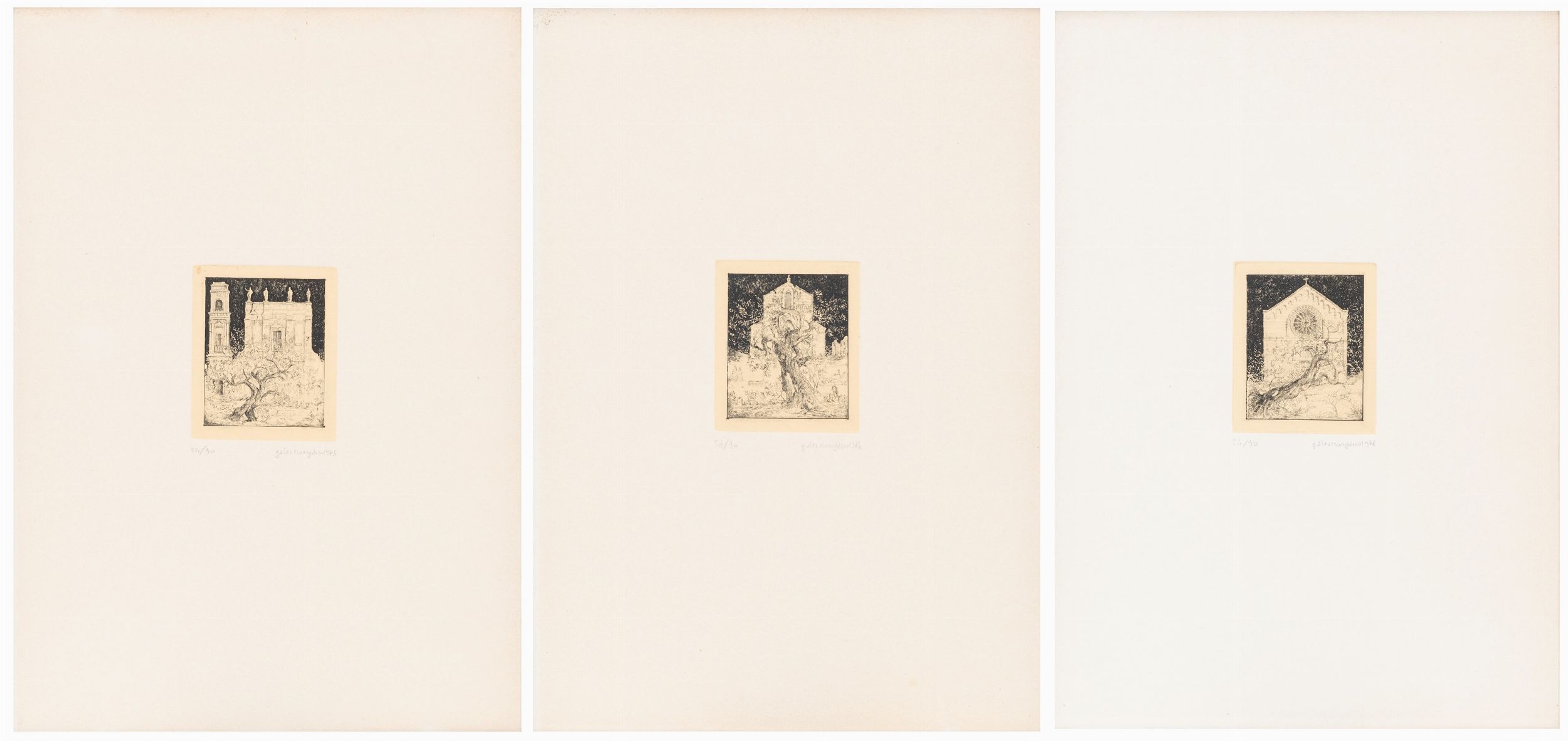 lotto di 3 acqueforti es. 54/90, cm. 9x7 (lastre) - 34x24 (fogli) cad.