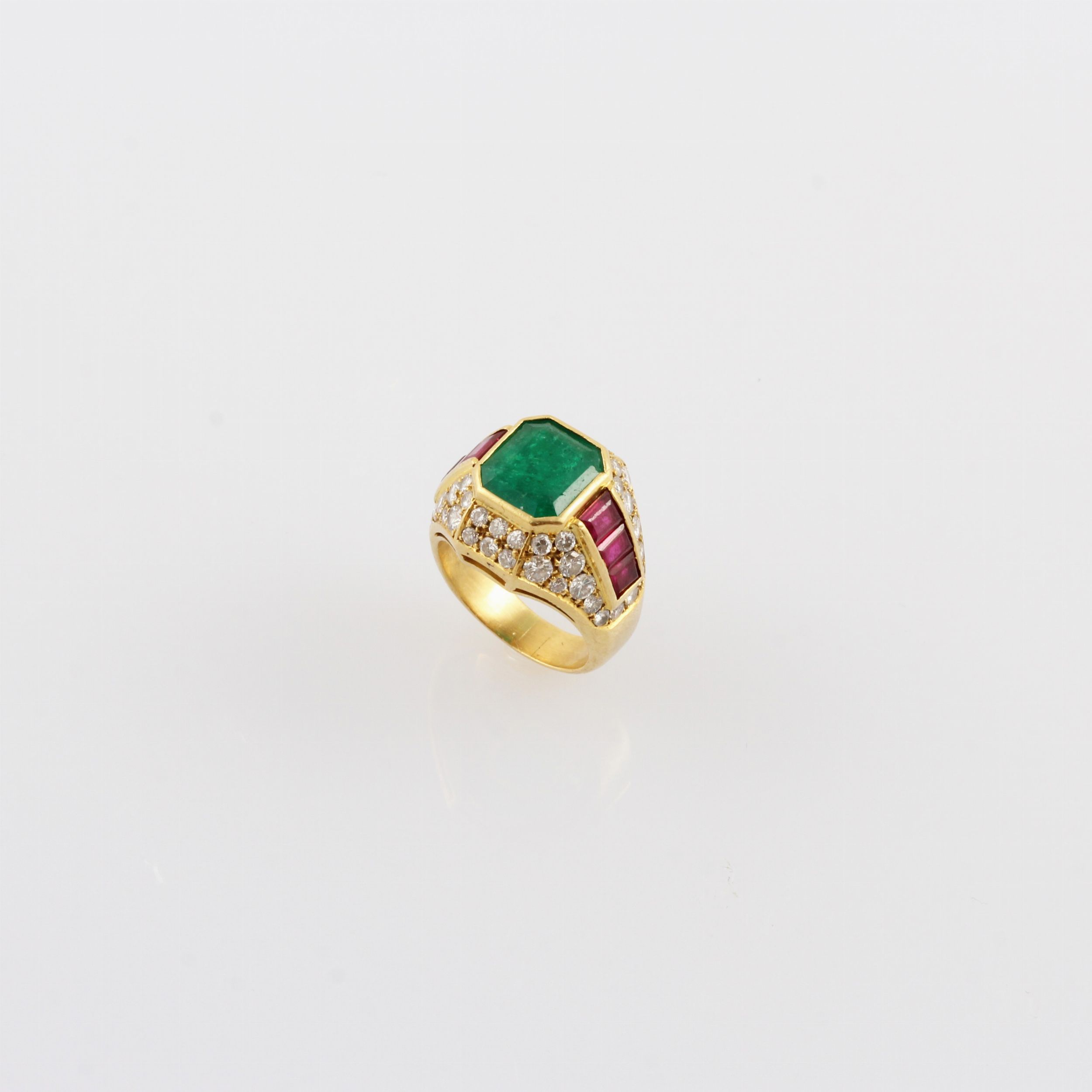 in oro giallo a titolo 850/1000 con smeraldo centrale affiancato da rubini e pavé di brillanti, gr. 12,4. (Sbeccature)