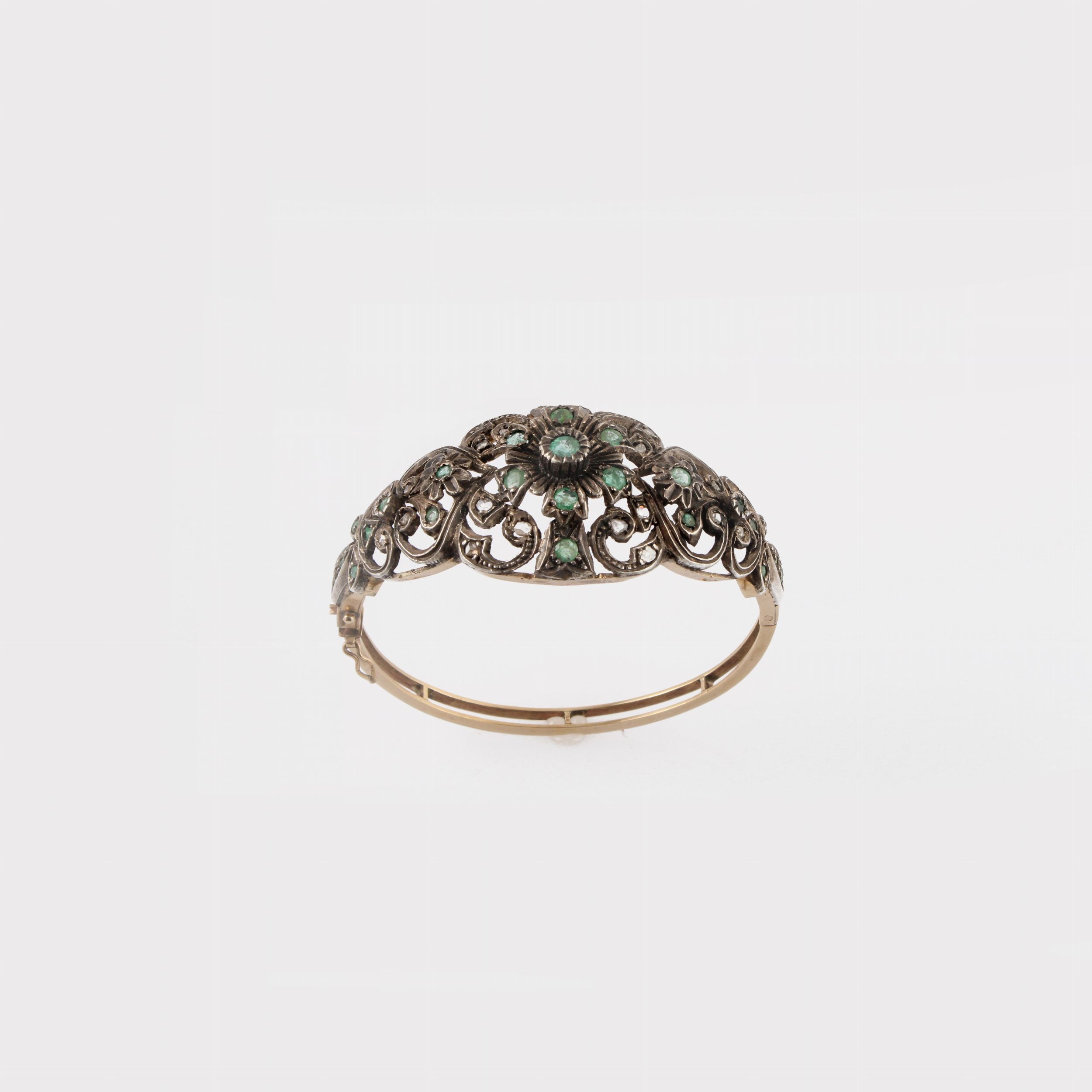 rigido in oro a titolo basso e argento traforato a volute e motivi floreali ornato da smeraldi e diamanti taglio a rosa (sbeccature), gr. 33,3