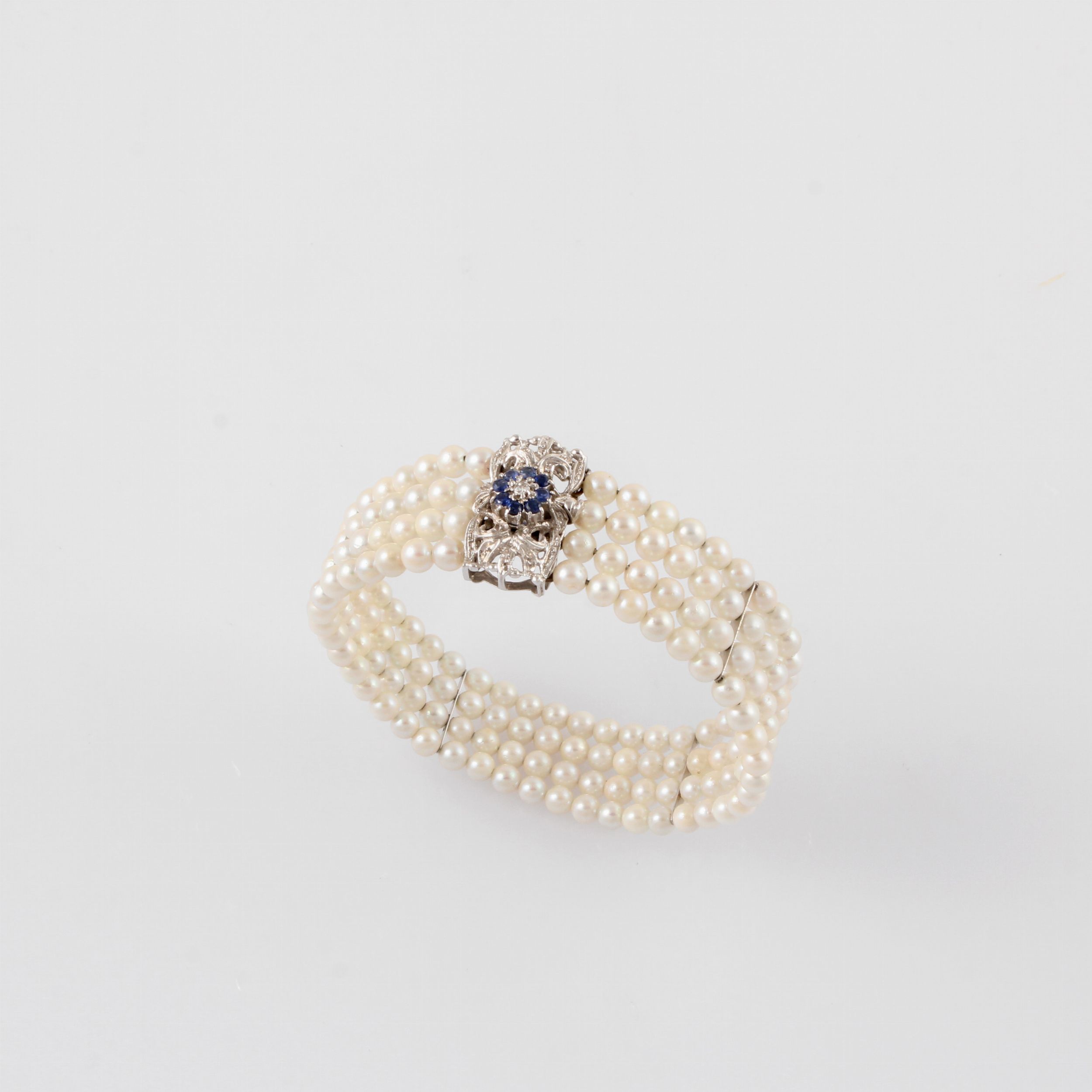 semirigido costituito da quattro fili di perle coltivate 4,5 / 4 mm, chiusura in oro bianco traforata con piccolo brillante e zaffiri, gr. 25,4.