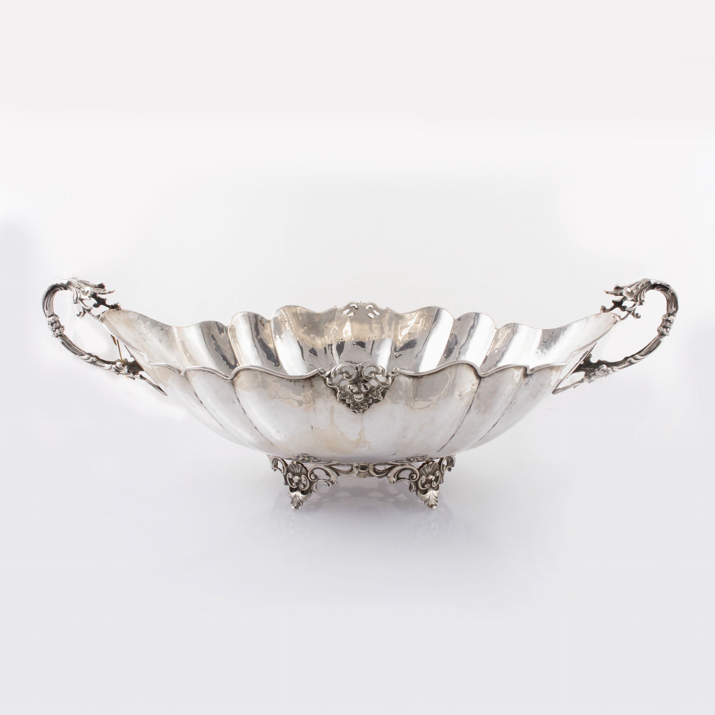 in argento 800 a navicella, corpo costolato a lavorazione martellata e applicazione centrale traforata a girali e frutti, bordo mosso e anse fogliate. Base traforata con piedini, gr. 868 ca., misure 48 x 21 cm, h 18 cm.