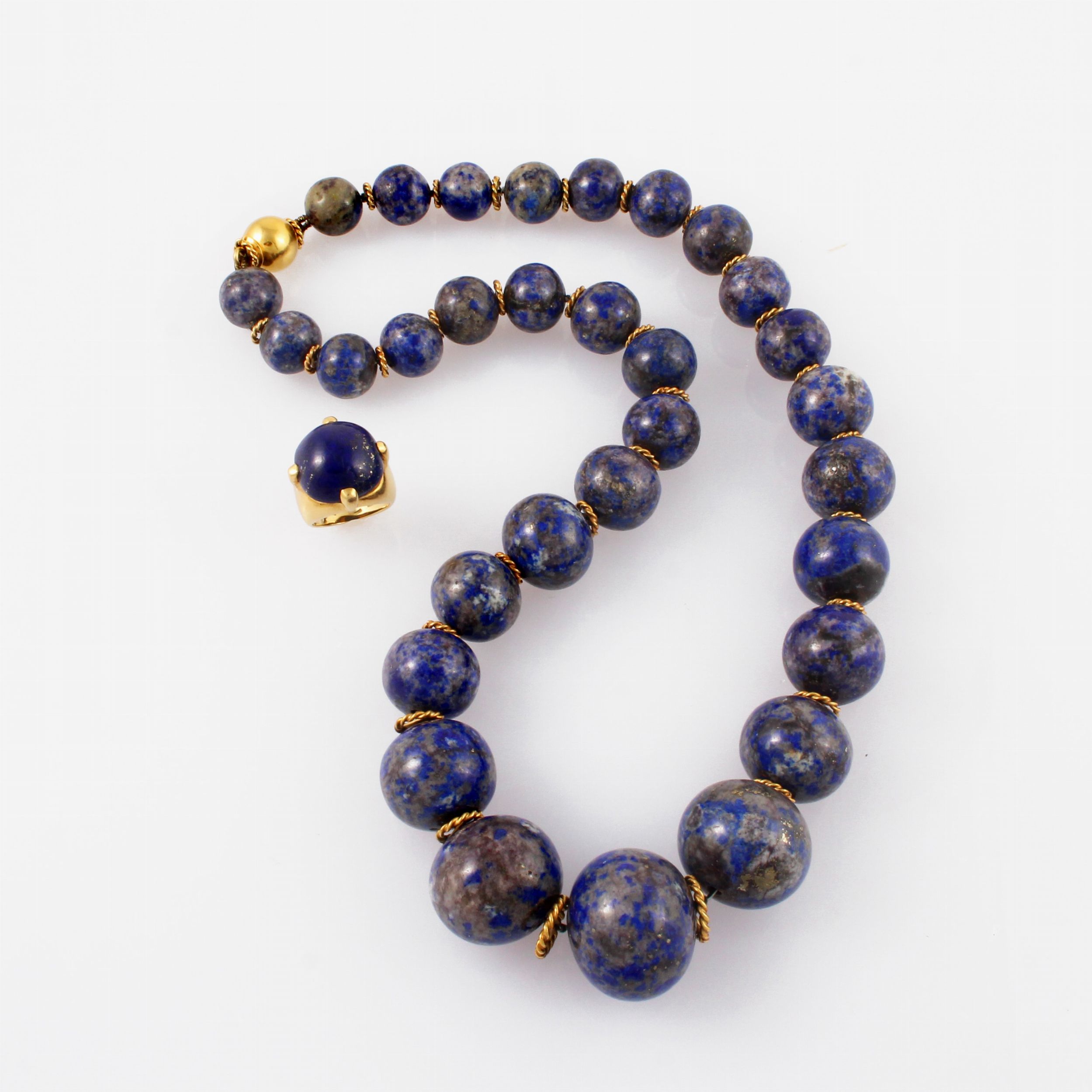 filo di sfere in lapislazzuli poste in gradazione alternate a rondelle in oro a filo ritorto, chiusura in oro giallo a sfera e anello a fascia in oro giallo con lapislazzuli centrale, gr. complessivi 249,2.