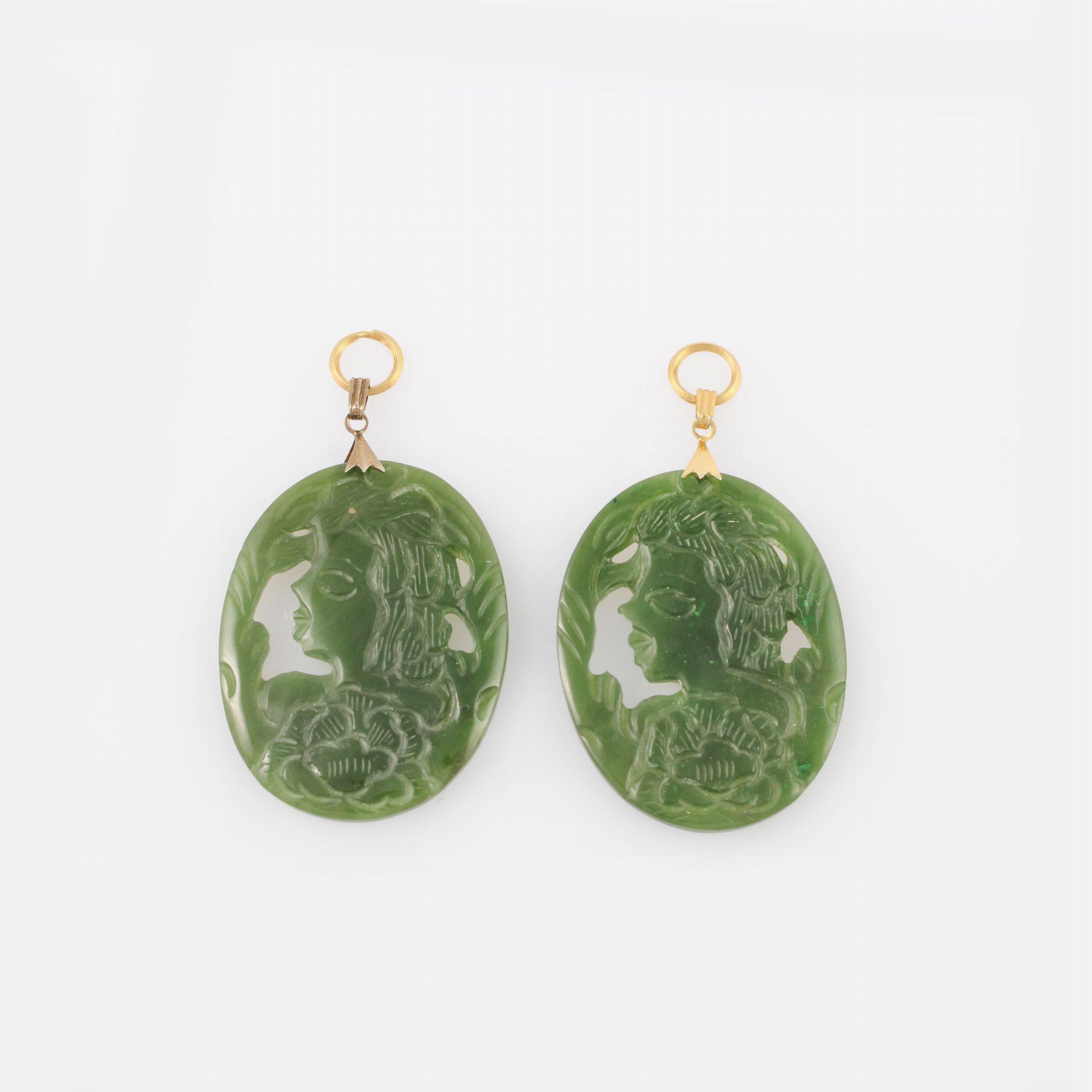 con placca ovale traforata in nefrite raffigurante un profilo femminile, montati in oro e metallo, gr. complessivi 21,9.