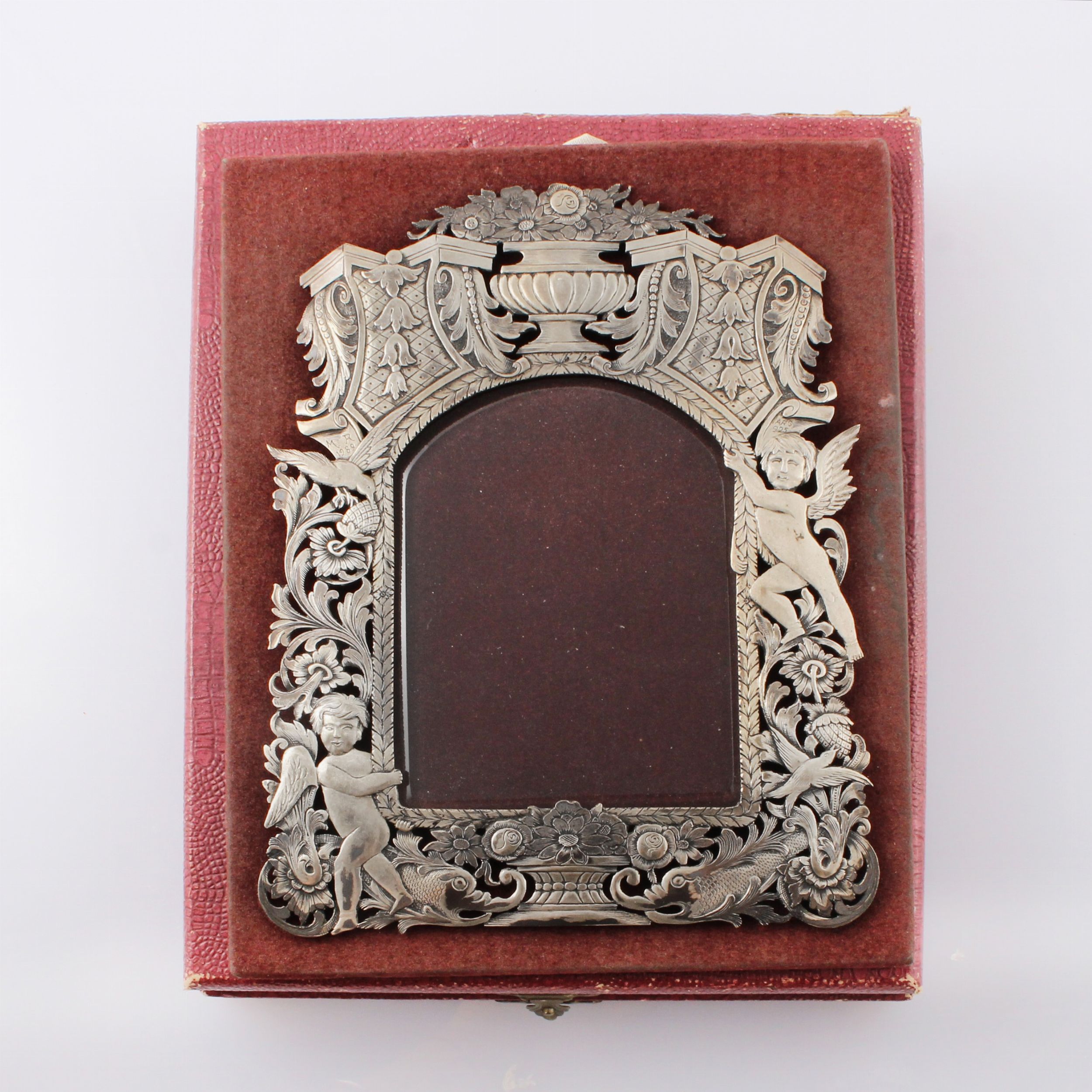 in argento 925 riccamente traforata con putti e motivi naturalistici, applicata a supporto in velluto, gr. netti 113 ca. Completa di vetro e scatola.