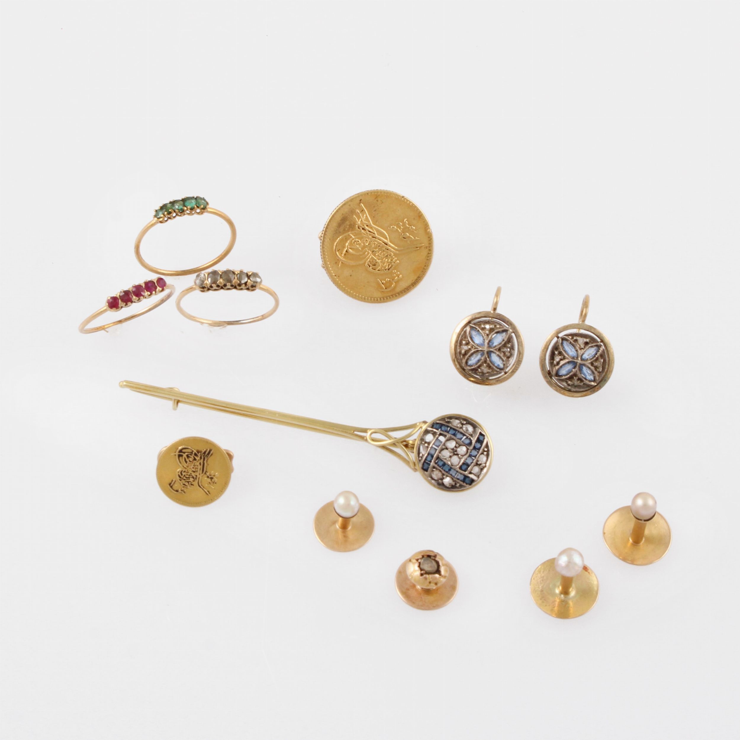 in oro e argento, costituito da due bottoni da sparato, quattro bottoni di cui tre con perline, tre fedi con piccoli rubini, smeraldi e diamanti a rosa, uno spillone e un paio di orecchini con pietre sintetiche e diamanti a rosa, del peso complessivo di gr. 27,9.