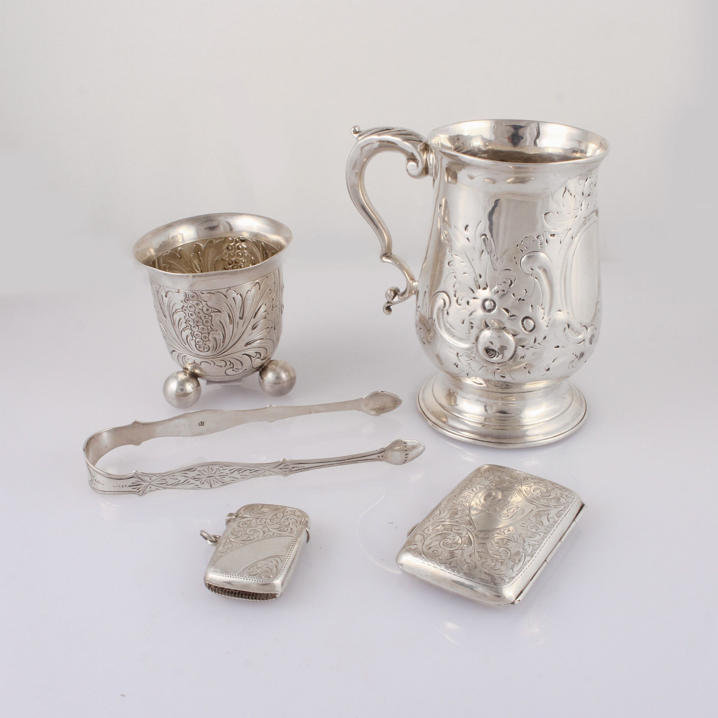 in argento 925 costituito da un boccale sbalzato con manico fogliato, due portafiammiferi cesellati a volute di cui uno con monogramma, un bicchiere sbalzato e cesellato a motivi vegetali con piedini a sfera e una pinza, gr. complessivi 518 ca.
