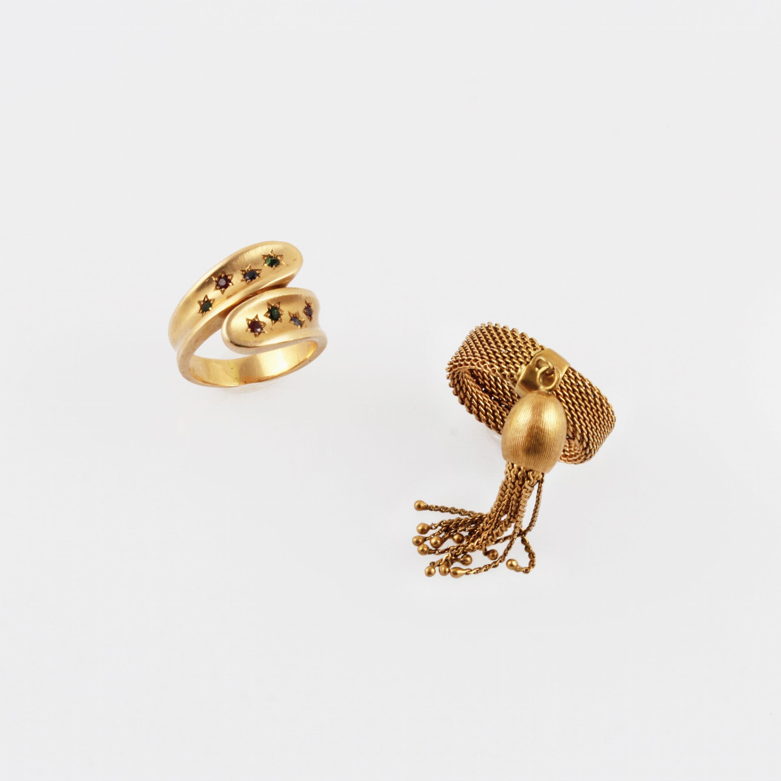 di due anelli in oro giallo di cui uno contrarié con piccoli rubini, zaffiri e smeraldi e uno a maglia morbida con frangia di catenelle, gr. complessivi 15.