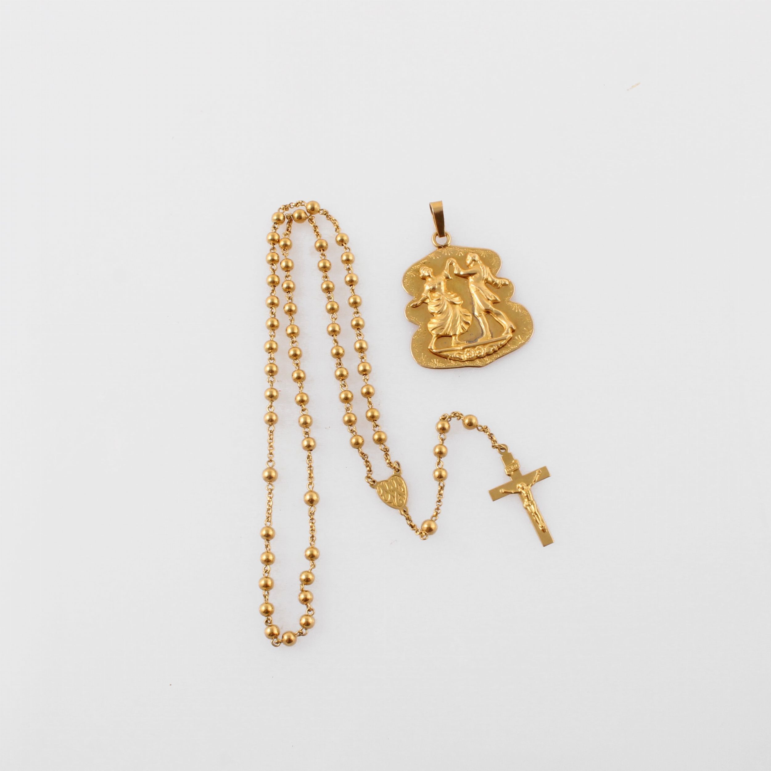 in oro giallo costituito da un pendente raffigurante una scena galante e un rosario, gr. complessivi 21.