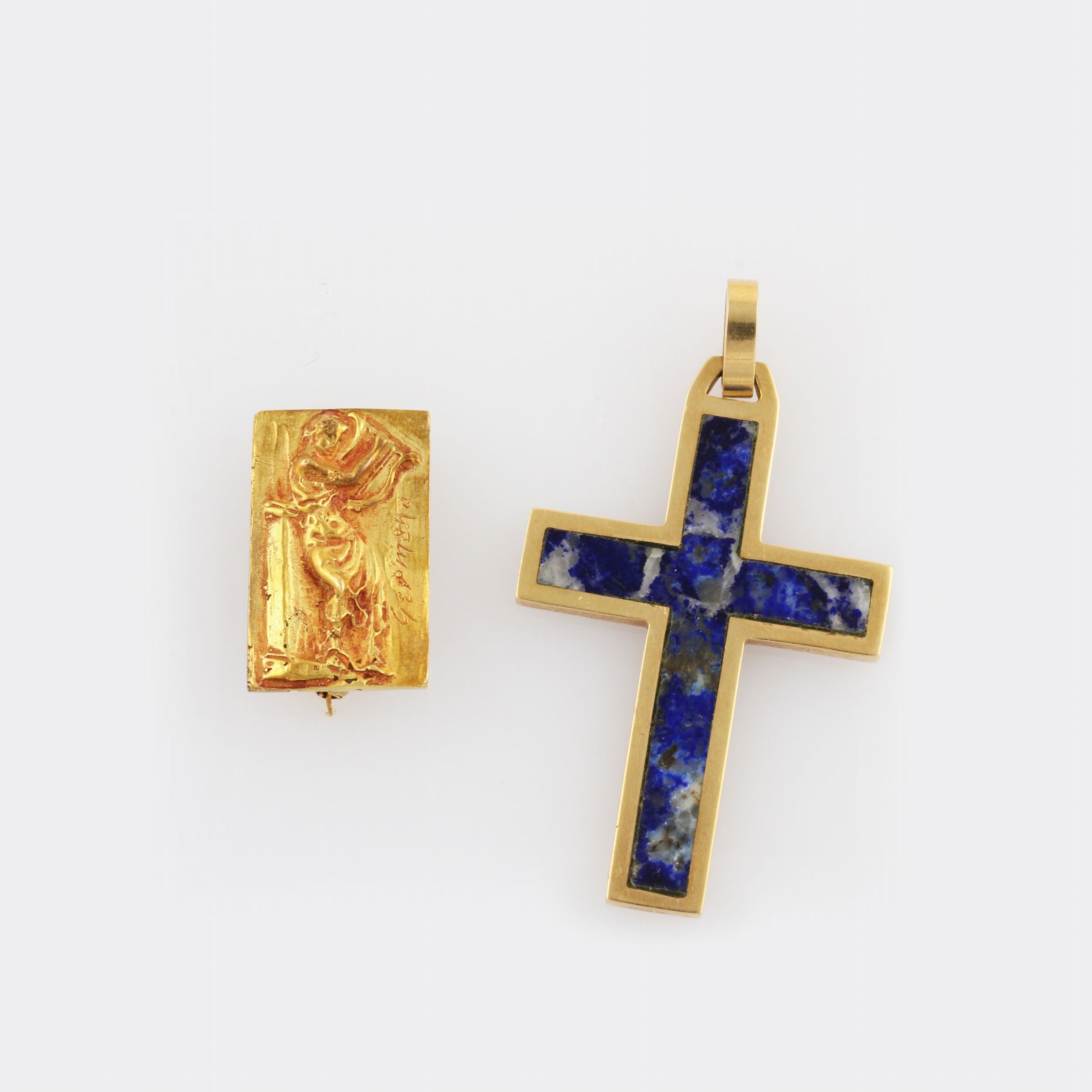 in oro giallo costituito da una spilla rettangolare con figura femminile e un pendente a croce con lapislazzuli, gr. complessivi 23,3.