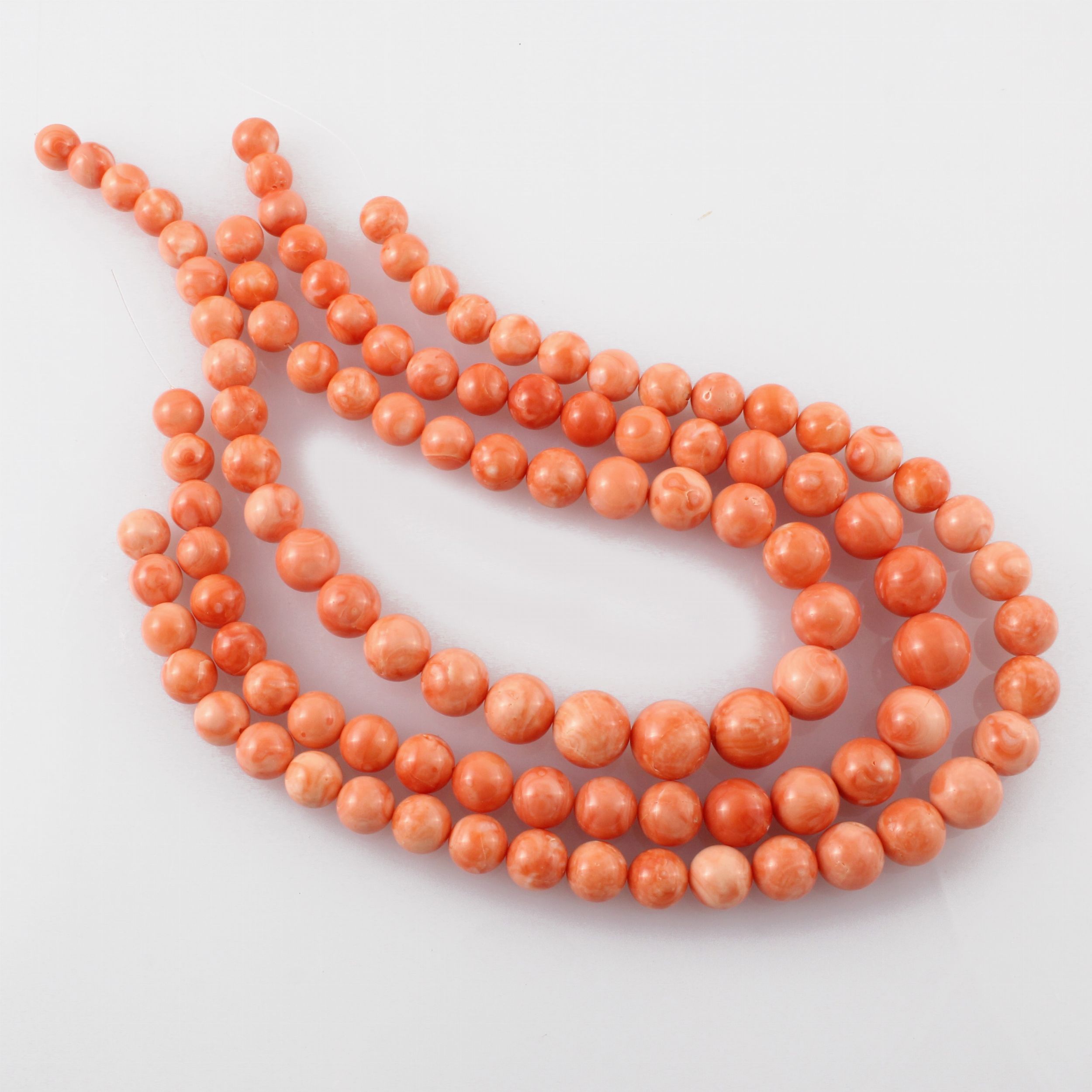 tre fili privi di chiusura composti da 106 sfere di corallo a scalare 17 / 12 mm ca., gr. complessivi 351,8.
