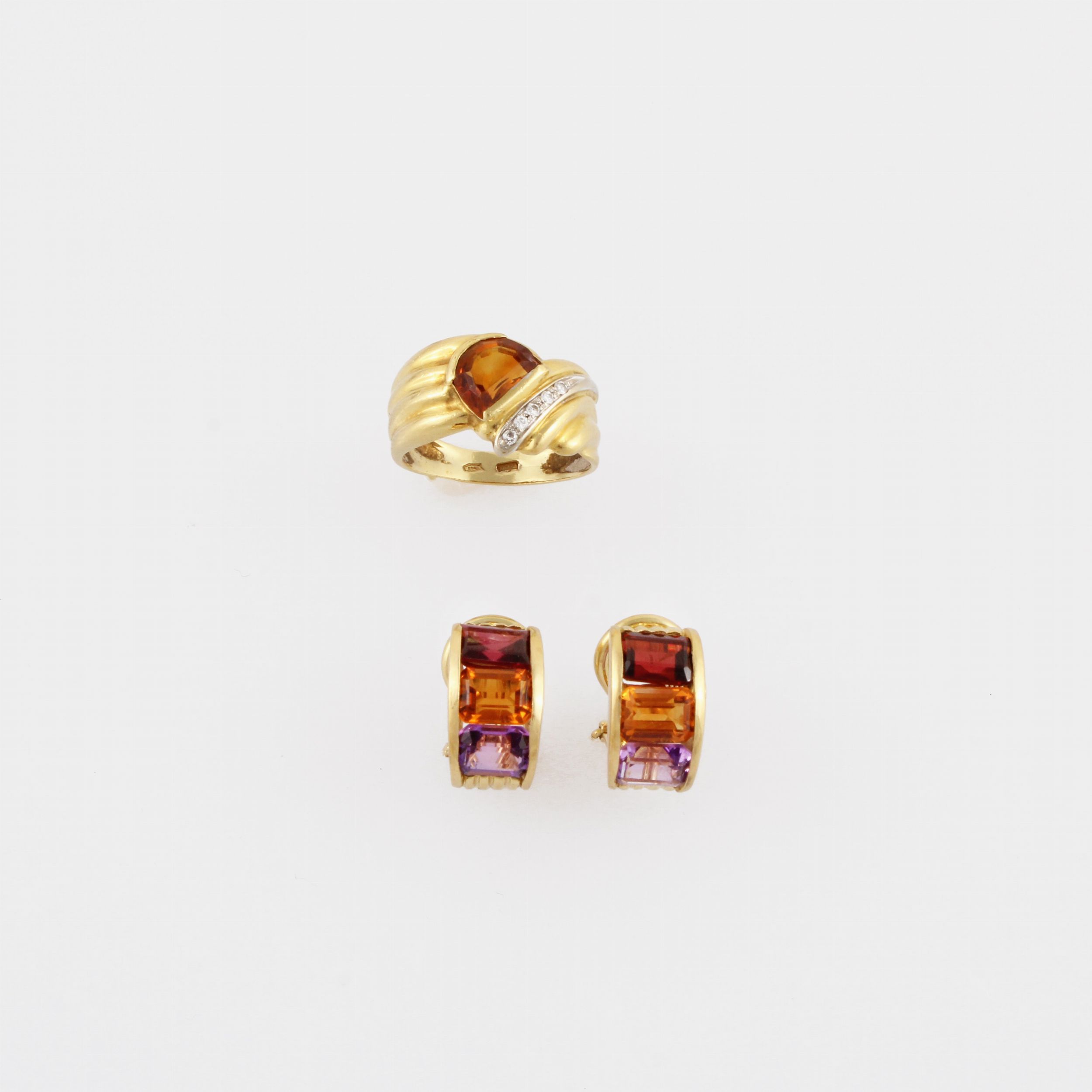 in oro giallo costituito da orecchini a clip con ametiste, quarzi citrini e granati e anello a fascia costolata con quarzo citrino (piccola sbeccatura) e brillanti, gr. complessivi 12,9.