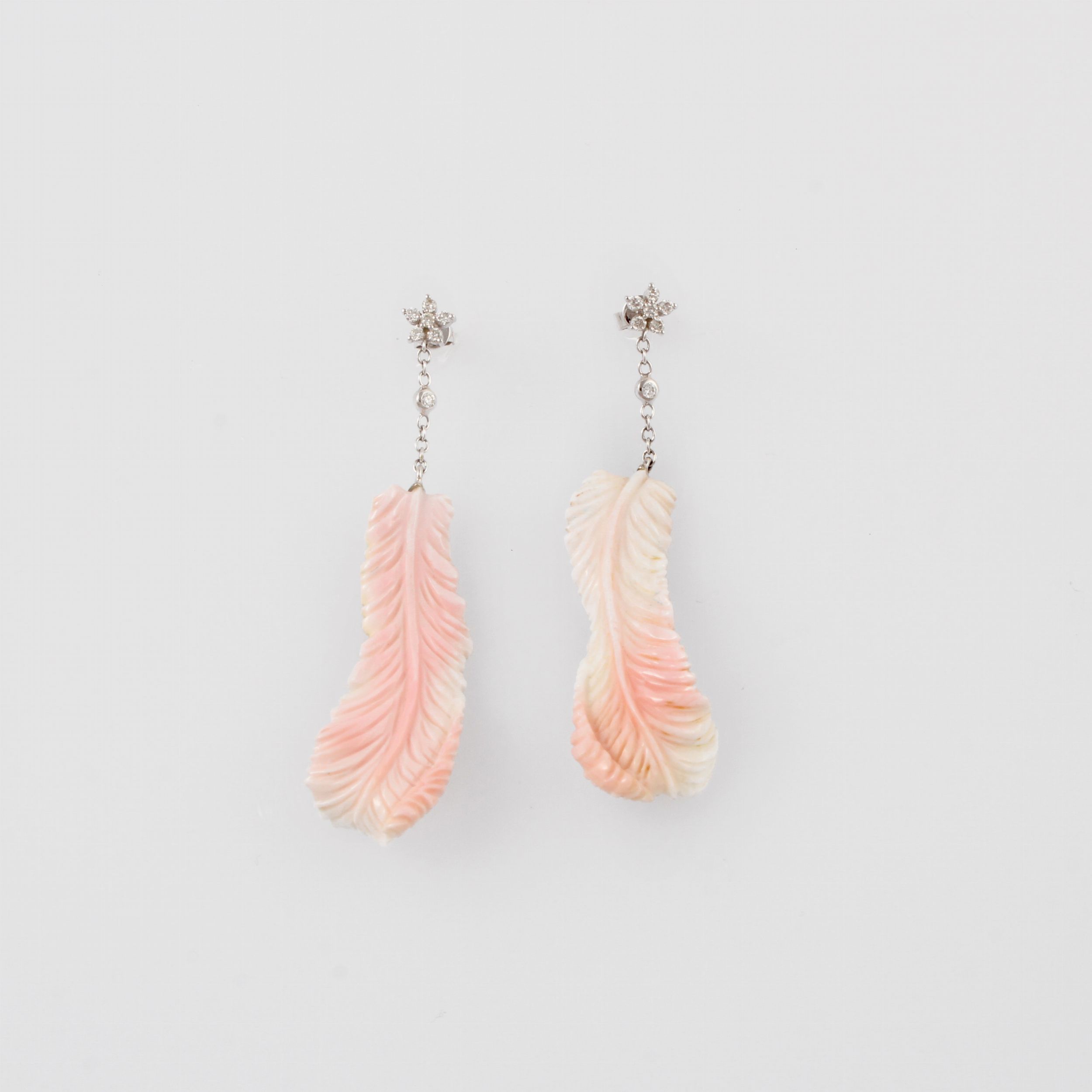 pendenti in oro bianco con piccoli brillanti e piuma sospesa in conchiglia incisa, gr. 11,0