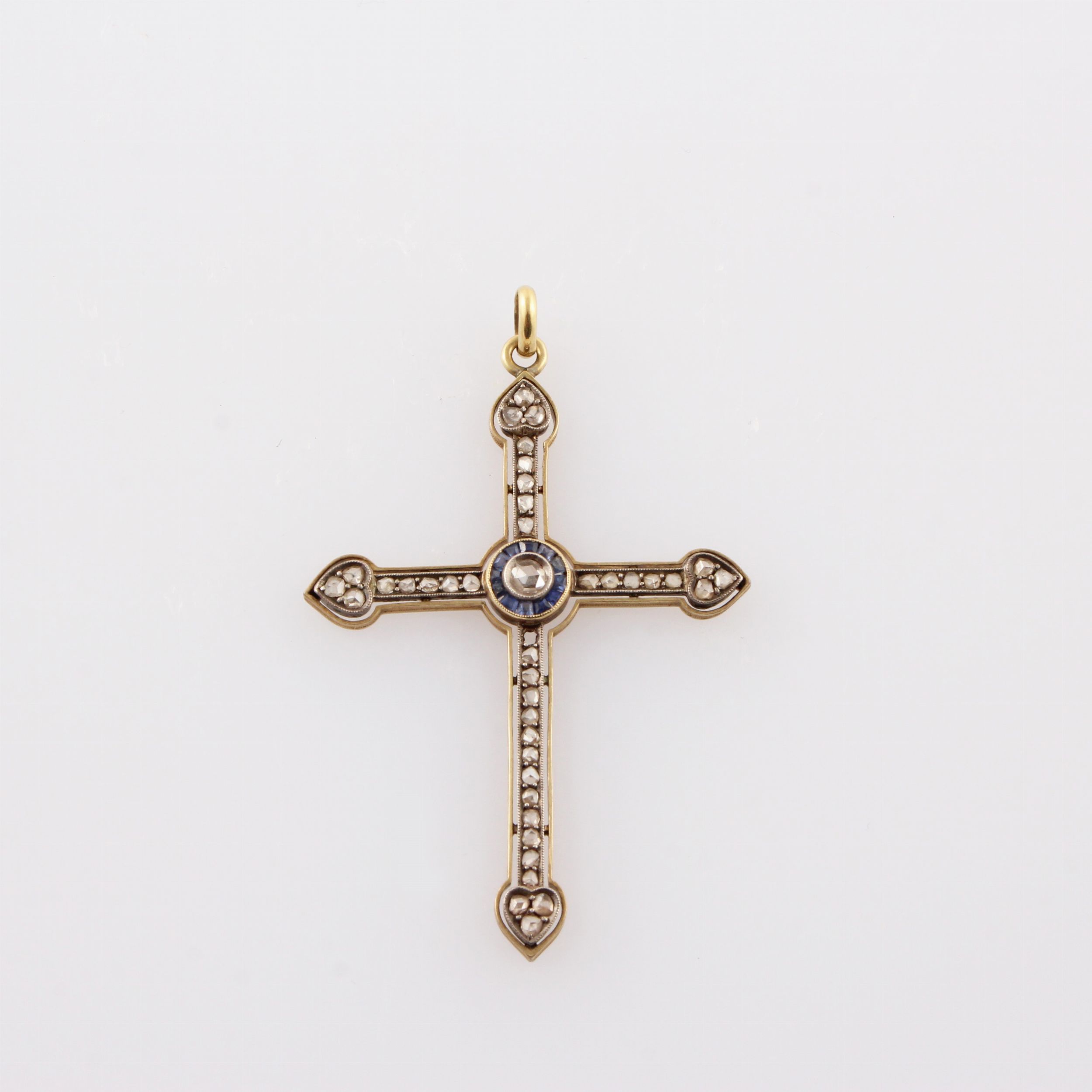 a croce in argento e oro con diamanti taglio a rosa (uno mancante) e zaffiri, gr. 6,3.