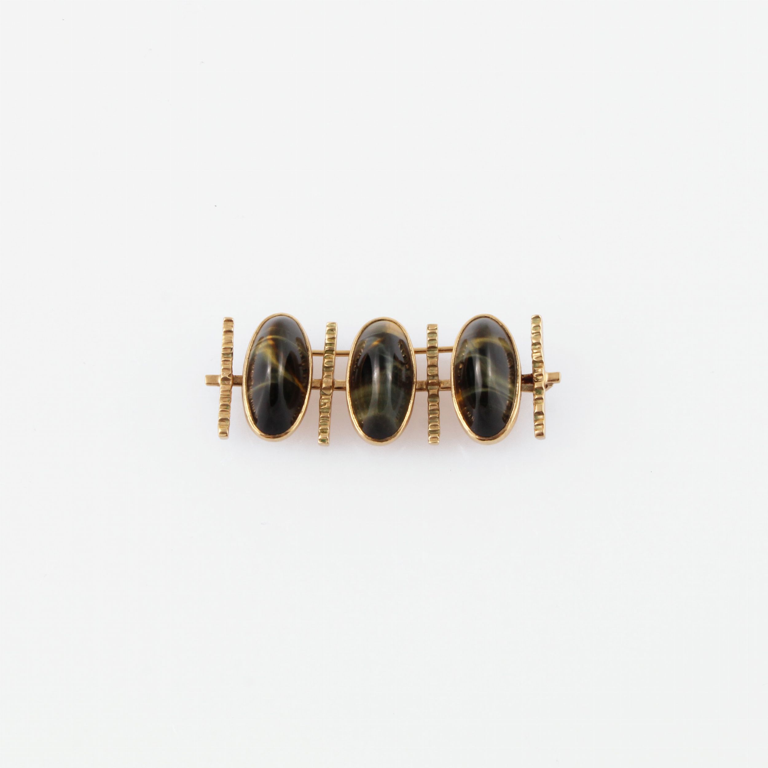 in oro 9 KT a barretta con tre quarzi occhio di falco cabochon dispositi in linea, gr. 14,4.