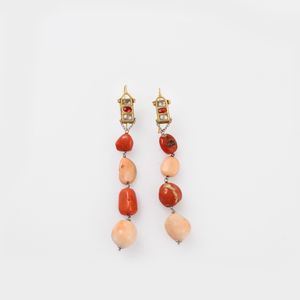 pendenti in oro e argento con coralli e pietre sintetiche, gr. 25. Lunghezza 11 cm ca.