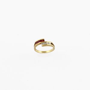 contrarié in oro giallo con diamanti carré e rubini, gr. 3,7. Misura 16,5