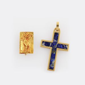 in oro giallo costituito da una spilla rettangolare con figura femminile e un pendente a croce con lapislazzuli, [..]
