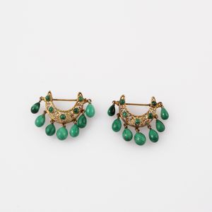 in argento dorato a semiluna traforate con gocce di malachite pendenti, gr. complessivi 16,1.