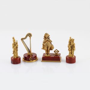 quattro statuine a foggie differenti in argento dorato su base in diaspro. Altezze varie (arpa 6 cm ca.)