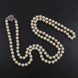 lungo filo di perle coltivate 7,5 mm, chiusura a fiore in oro bianco con piccoli rubini, gr. 75. Lunghezza 102 [..]
