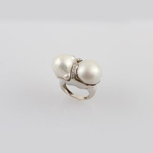 in oro bianco con due perle coltivate scaramazze e piccoli brillanti, gr. 28,8. Misura 16