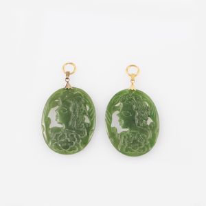 con placca ovale traforata in nefrite raffigurante un profilo femminile, montati in oro e metallo, gr. complessivi [..]