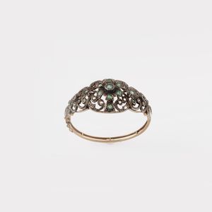 rigido in oro a titolo basso e argento traforato a volute e motivi floreali ornato da smeraldi e diamanti taglio [..]