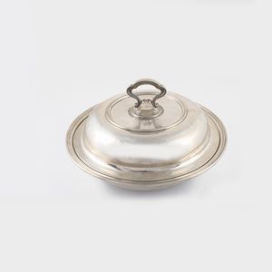 in argento 800 a forma circolare, coperchio con presa ad anello sagomata e bordure gradinate, gr. complessivi [..]