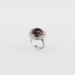 in oro bianco con ametista centrale contornata da diamanti taglio a rosa, gr. 8,3. Misura 18,5