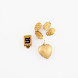 in oro giallo costituito da una spilla da asola con smalto blu e scritta benemerito, un paio di gemelli ovali [..]