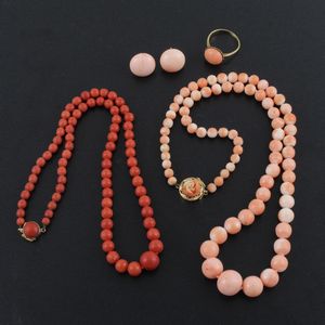di due collane, un paio di orecchini e un anello in corallo e oro giallo, gr. complessivi 83,7. Lunghezza collane [..]