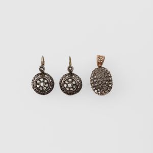 di orecchini in oro e argento a rosone traforati con diamanti taglio a rosa e pendente ovale in oro a titolo basso [..]