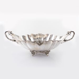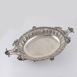 in argento 800 a forma ovale decoro a sbalzo e ricca bordura applicata a motivi vegetali, manici traforati ornati [..]
