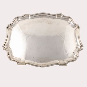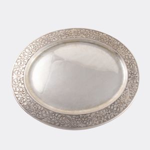 in argento liscio a corpo ovale con tesa cesellata a motivi vegetali, gr. 741 ca. Misure 38,5 x 31,5 cm