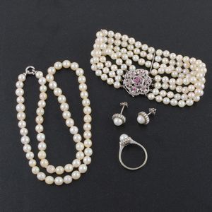 di collana, bracciale, orecchini e anello in oro bianco con perle coltivate, piccoli diamanti e rubini, gr. complessivi [..]