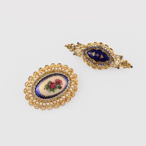 in oro giallo traforate con smalti policromi, zaffiri (uno mancante) e perle, gr. complessivi 22,2. Dimensioni [..]