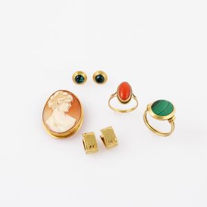 in oro giallo costituito da due anelli rispettivamente con malachite e corallo, due paia di orecchini di cui [..]