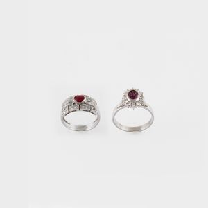 in oro bianco di cui uno con rubino centrale contornato da brillanti e uno con rubino e pietre sintetiche, gr. [..]