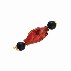 raffigurante due mani nell'atto di stringersi in corniola (difetti) con due sfere in diaspro alle estremità. [..]