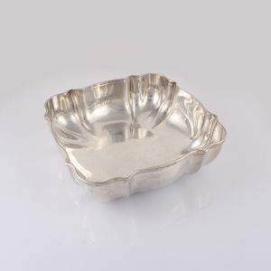 in argento 800 a forma quadrata con bordo mistilineo e nervature, gr. 384 ca., dimensioni 19,5 x 19,5 cm, h. 5,8 [..]