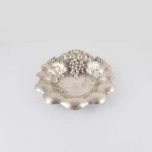 in argento Sterling a corpo circolare svasato con bordo smerlato, lavorato a sbalzo con grappolo d'uva e pampini, [..]