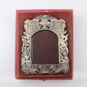 in argento 925 riccamente traforata con putti e motivi naturalistici, applicata a supporto in velluto, gr. netti [..]