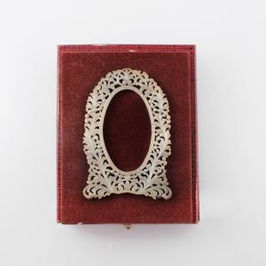 in argento 925 a forma ovale sagomata, traforata a motivi vegetali, applicata a supporto in velluto, gr. netti [..]