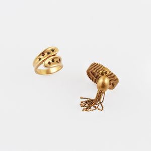 di due anelli in oro giallo di cui uno contrarié con piccoli rubini, zaffiri e smeraldi e uno a maglia morbida [..]