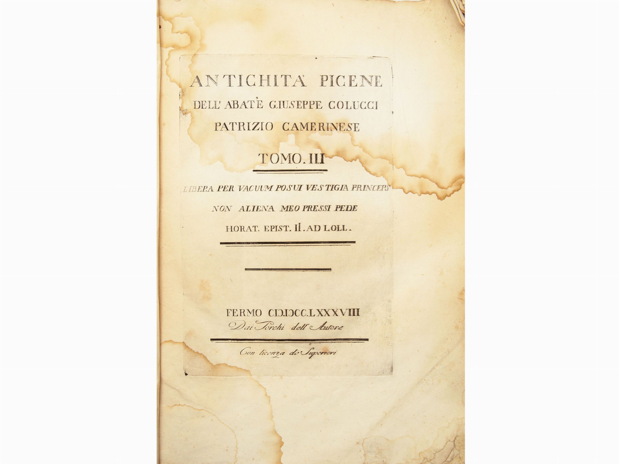 Fermo: Dai Torchi dell'Autore, 1788, Tomo III (di 31). In folio (360x240 mm). XVI, LII, 416 p., 1 c. di tav. (ritratto calcografico di Francesco Saverio De Zelada disegnato da Gaspar Sibilla e inciso da Bartolomeo Ricci).