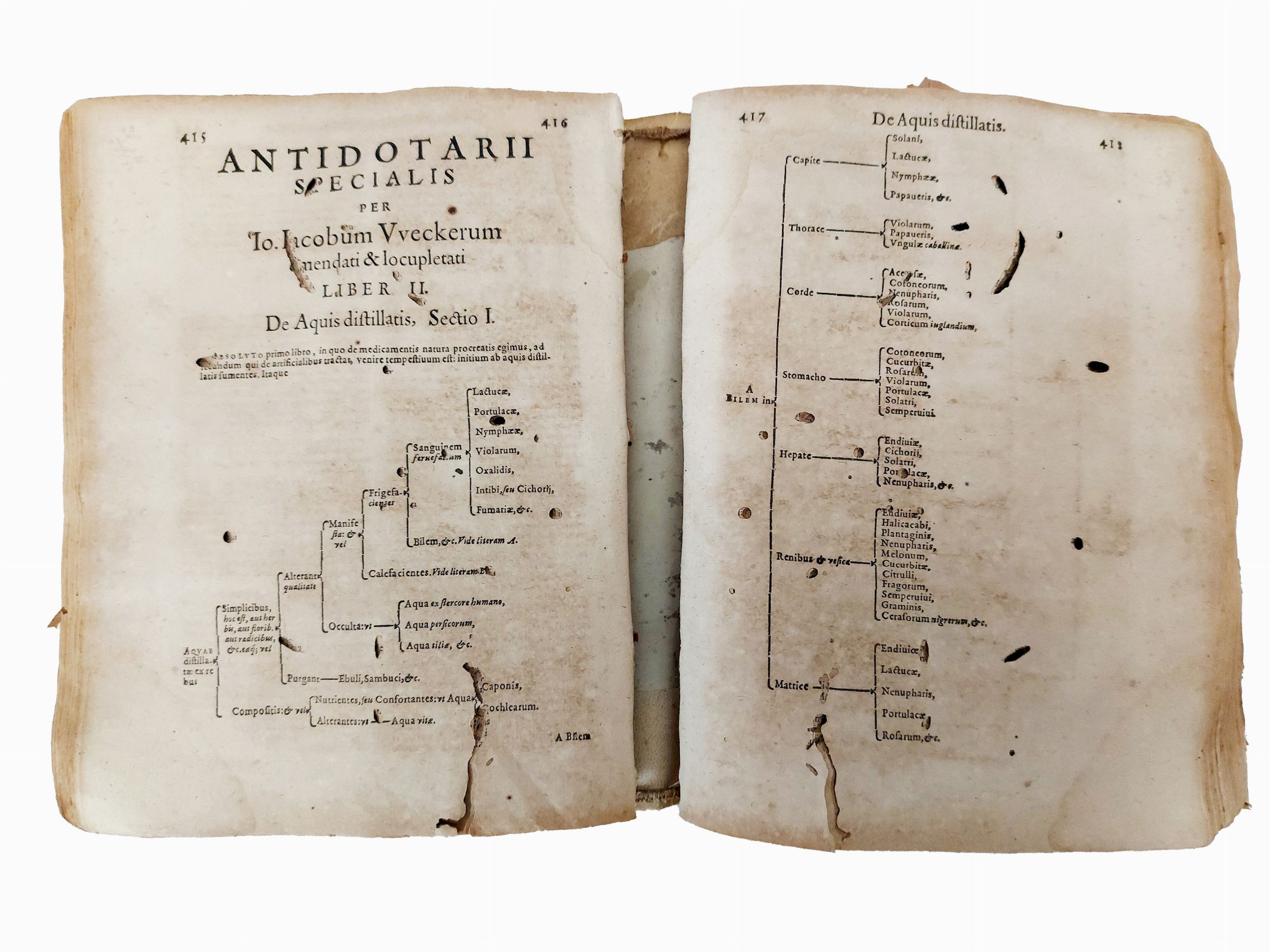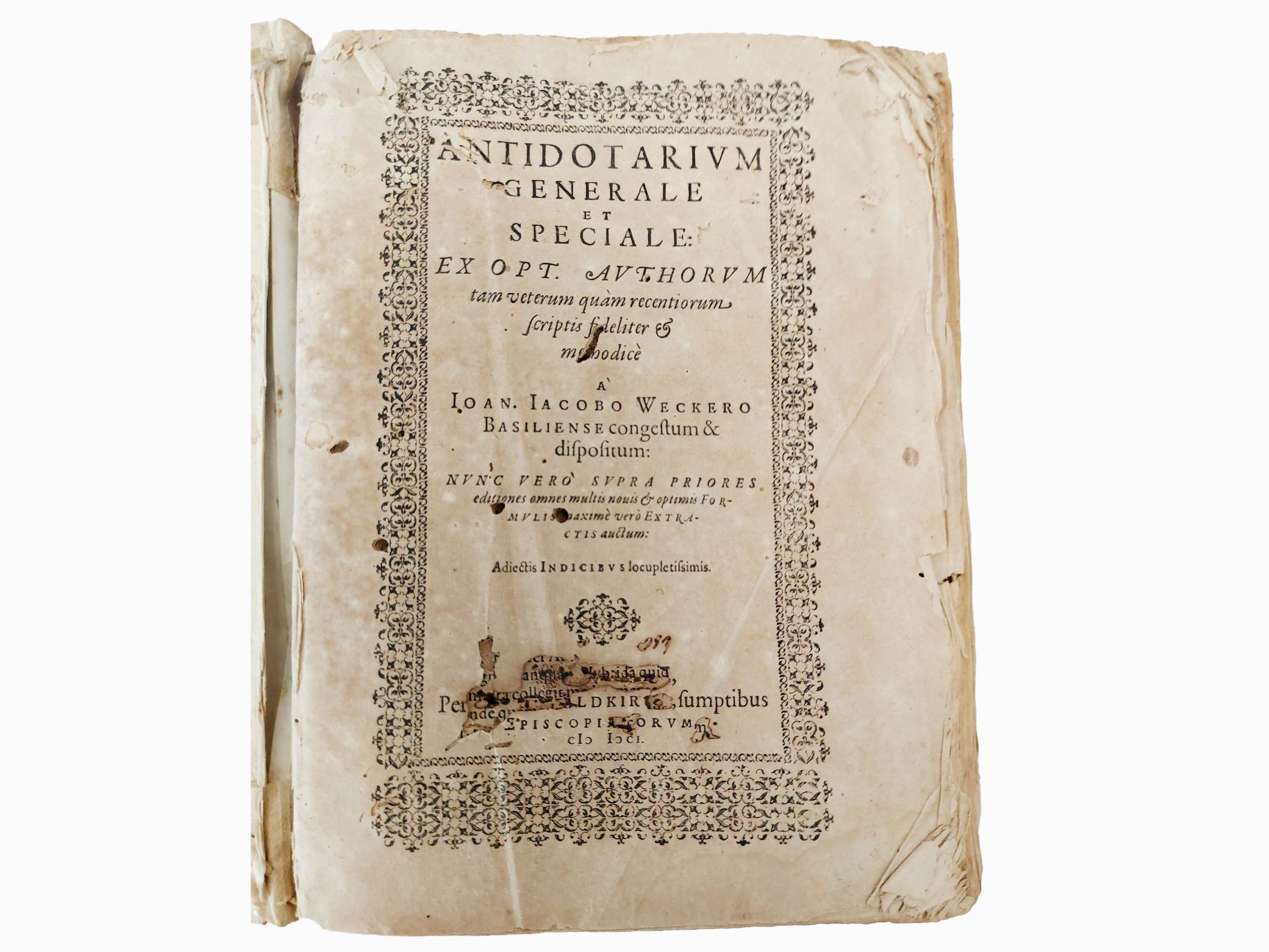 ... tam veterum quàm recentiorum scriptis fideliter & methodicè a' Ioan. Iacobo Weckero Basiliense congestum & dispositum: nunc veṛ supra priores editiones omnes multis nouis & optimis formulis, maximè veṛ extractis auctum: adiectis indicibus locupletissimis, Basileae: per Conr. Waldkirch, sumptibus Episcopianorum, 1601. In-4º (240x180 mm). 2 pt. con propri frontespizi. Titolo della pt. 2: Antidotarium speciale. [8] c., 222 col., [1] p., [2] c.; [6] c. 1210 col., [1] p., [15] c. Legatura in piena pergamena con titolo calligrafico al dorso, con mancanza. Interno fragile, con significative gallerie di tarlo, con perdita di testo, e zone fortemente brunite