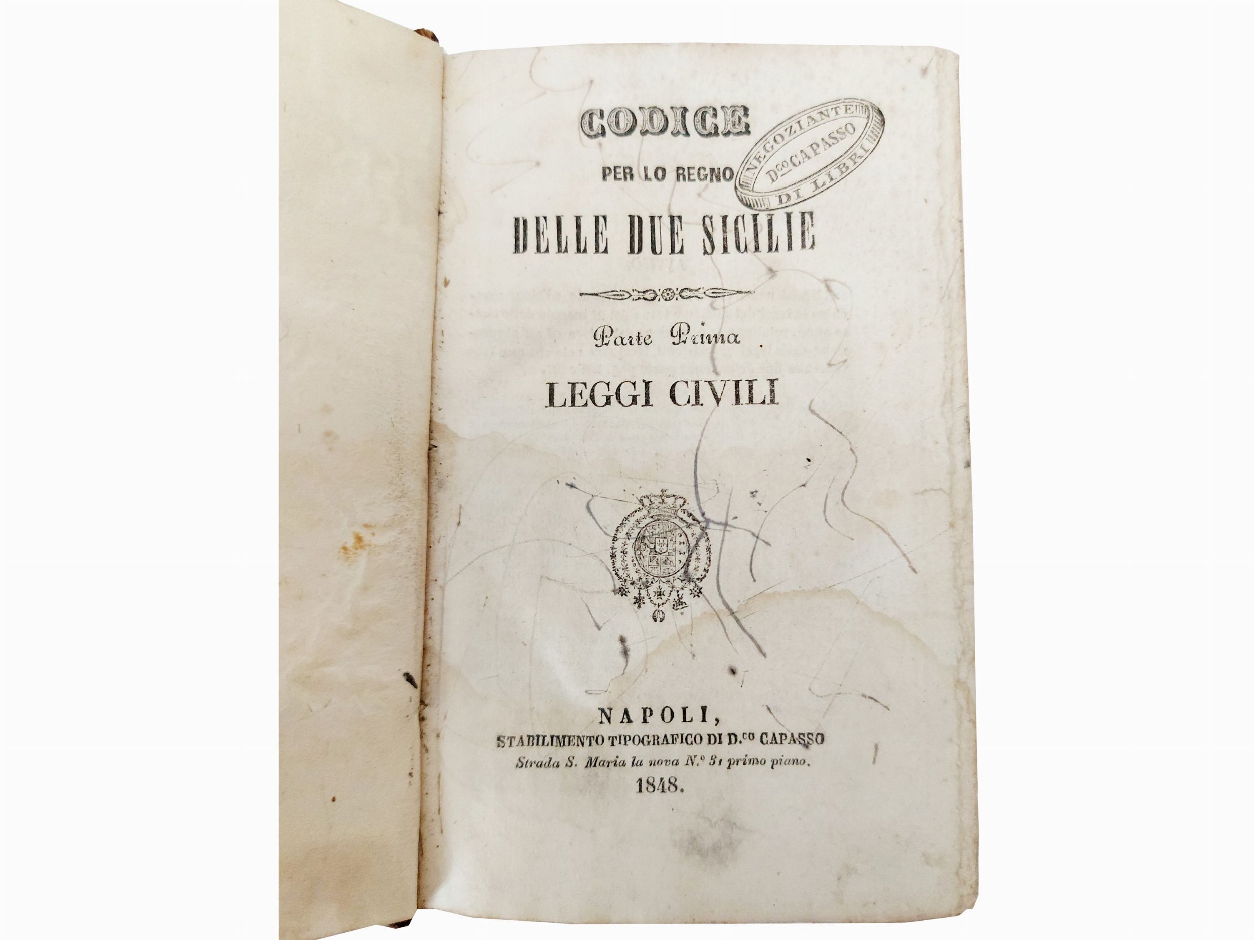 Napoli: Stabilimento Tipografico di D.co Capasso, 1848. (165x105 mm). Parte prima. Leggi Civili; XII, 288. p. (l'ultima p. erroneamente numerata 828) - Parte seconda. Leggi Penali: IV, 87 p. - Parte terza. Leggi della procedura ne' giudizi civili: III, 214 p. - Parte quarta. Leggi della procedura ne' giudizi penali: II, 100 p. - Parte quinta. Leggi di eccezione per gli affari di commercio: IV, 107 p. - Segue: Statuto penale militare per lo Regno delle Due Sicilie: Statuti penali per l'armata del mare e pe' reati commessi da' forzati e loro custodi: VII, 100 p. (mancante la tav. ripiegata in fine del vol.). Legatura in pena pelle con fregi dorati al dorso, mende al morso, segni d'uso, spellatura al piatto posteriore. Fioriture per lo più alle carte iniziali