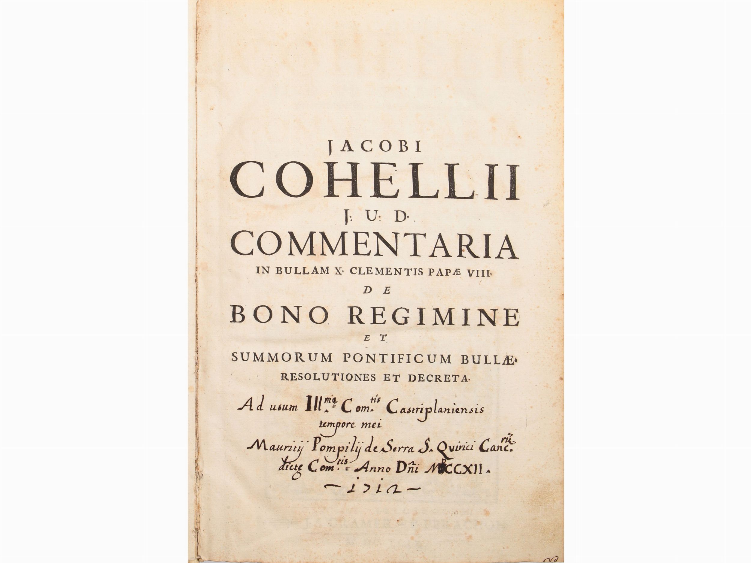 Jacobi Cohellii J.U.D. Urbevetani [...] Commentaria in Bullam X Clementis papae VIII De bono regimine rerum ad dictas Universitates spectantium multiplici doctrina, & eruditione repleta, ac diu exoptana, Caroli Cartharij J.U.D. urbetani [...] Summorum pontificum bullae, ut & resolutiones & decreta dictarum universitatum interesse spectantia.