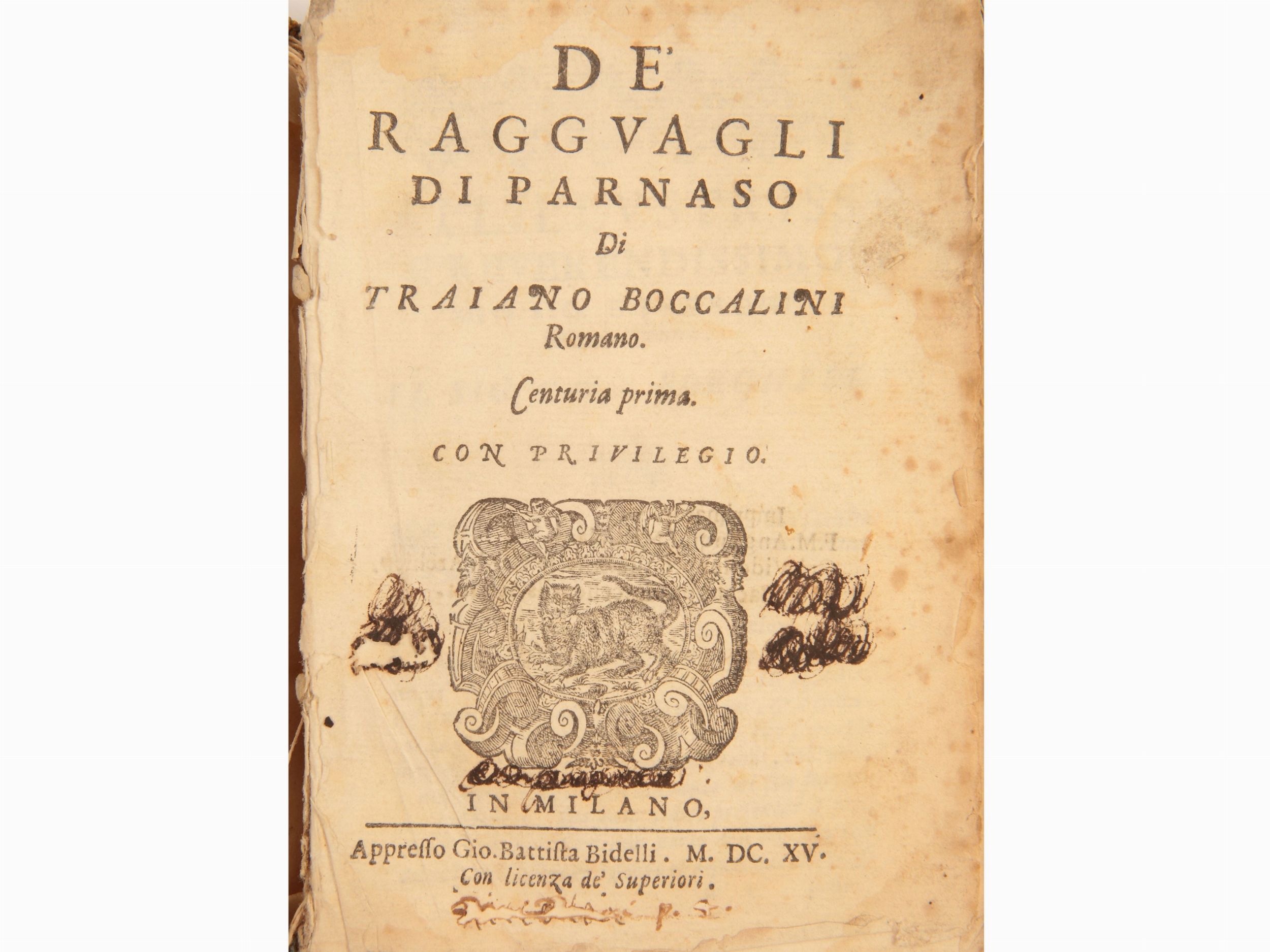In Milano: appresso Gio. Battista Bidelli, 1615. In-8° (155x110 mm). [24], 472 p. Iniziali e fregi xilografici. Legatura coeva in piena pergamena muta, con piccole mende e macchie ai piatti Frontespizio staccato con mancanze e macchie. Fioriture diffuse