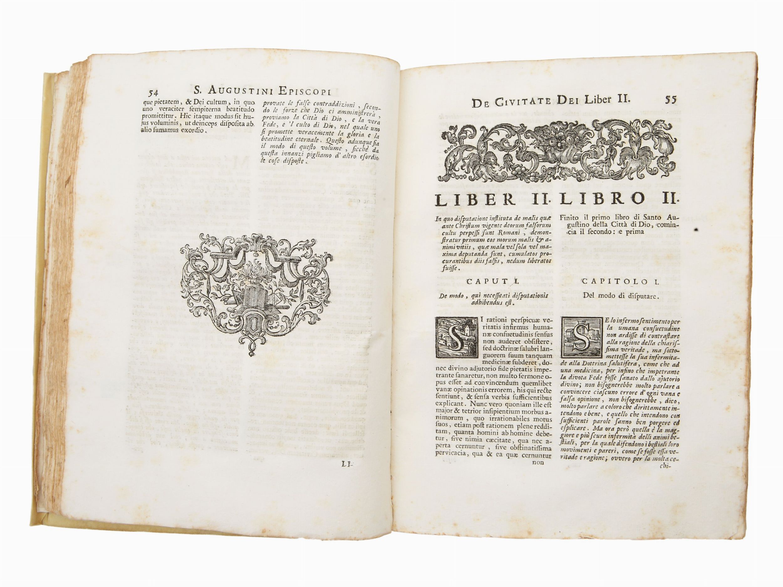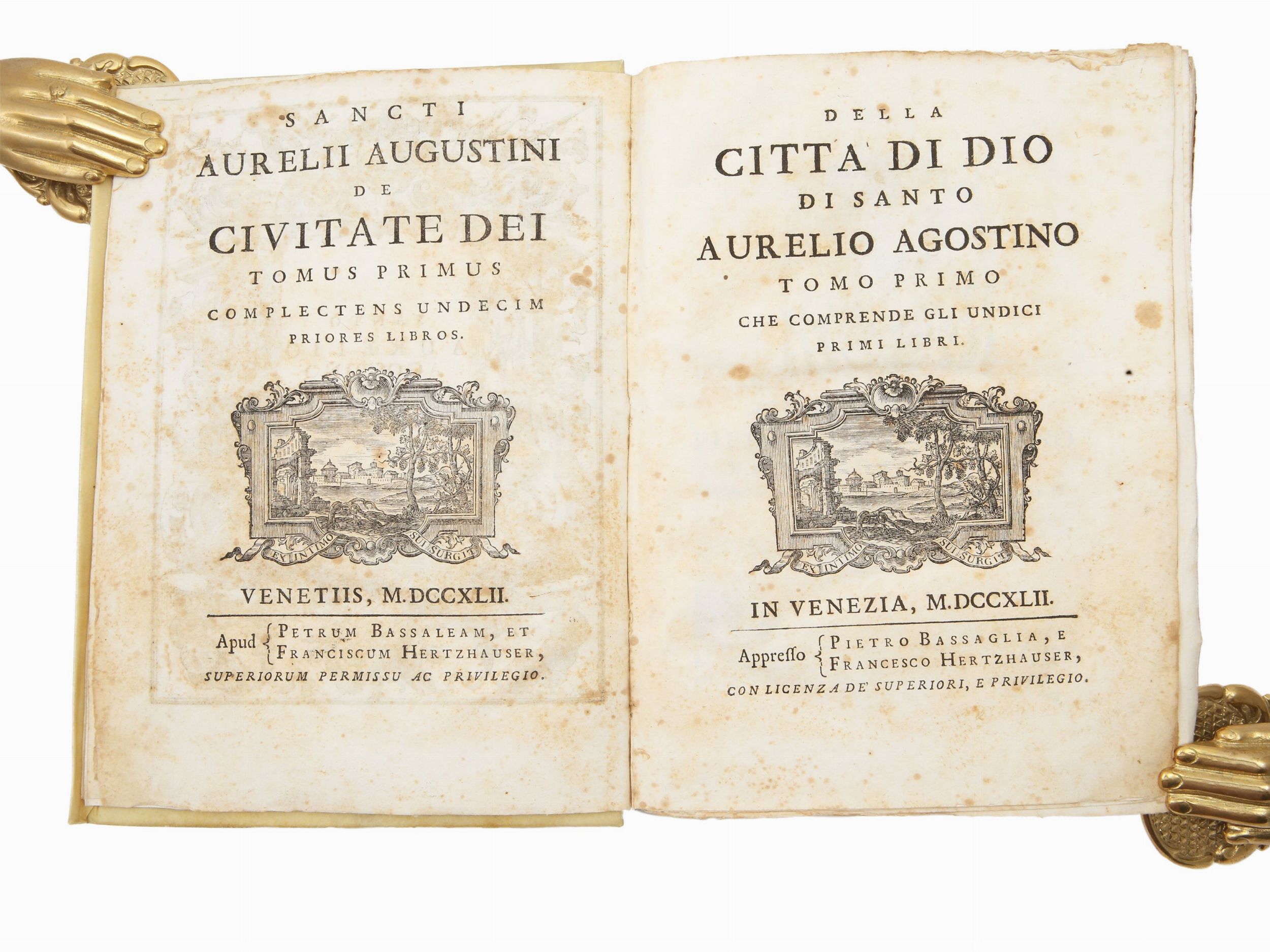 In Venezia: appresso Pietro Bassaglia, e Francesco Hertzhauser, 1742, 2 voll. In-4° (250x170 mm). Tomo primo che comprende gli undici primi libri: CXVI, 559, [1] p. - Tomo secondo che comprende gli altri undici libri: 754, [2] p. Frontespizio in latino a fronte. Testo bilingue latino e italiano su due colonne. Antiporte con ricca cornice allegorica figurata, sottoscritte da J. B. Jackson. Testatine, iniziali figurate e finalini xilografici. Legatura non coeva in piena pergamena con titolo calligrafico al dorso. Fioriture (2)